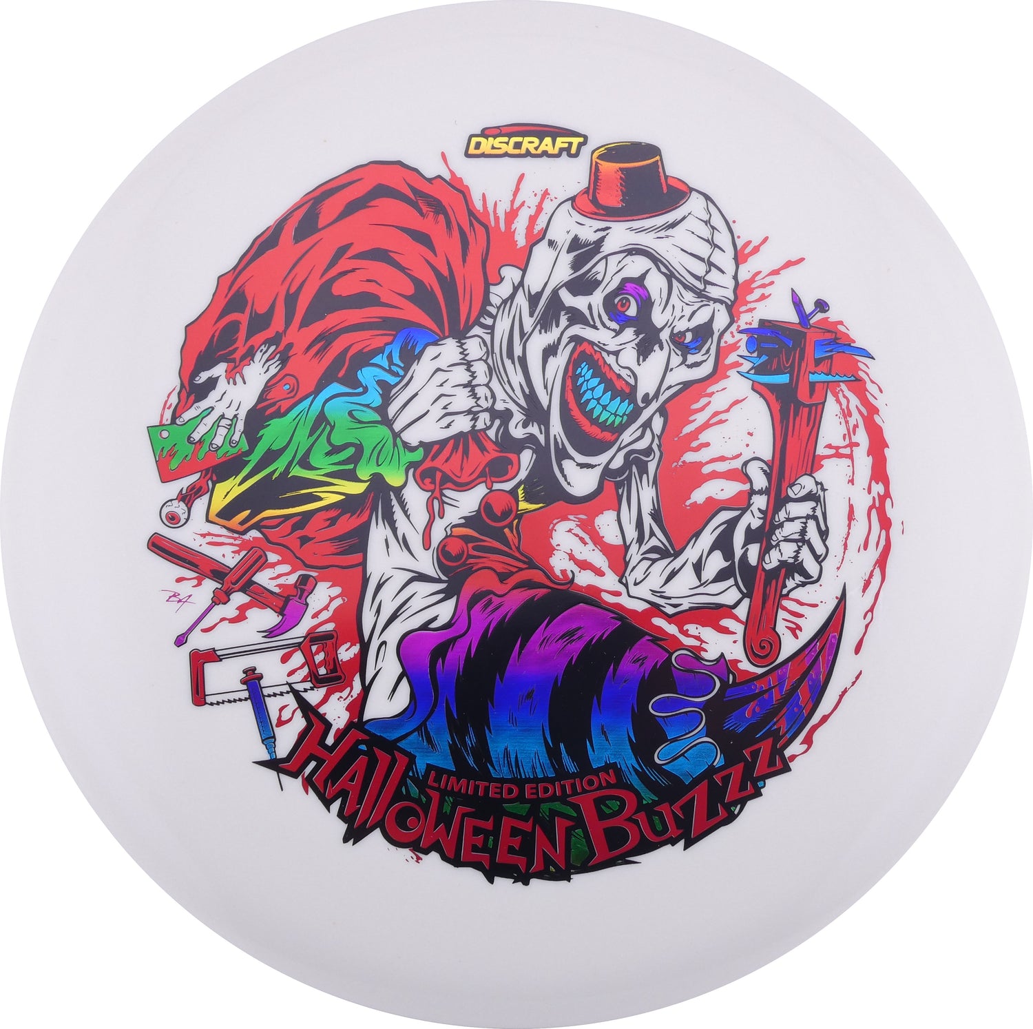 Under the glow of night, the 2025 Tri-Foil Glo Halloween Buzzz emerges from the shadows. Featuring an ominous clown silhouette layered with three haunting foils, this limited-edition Buzzz delivers both precision flight and bone-chilling style.