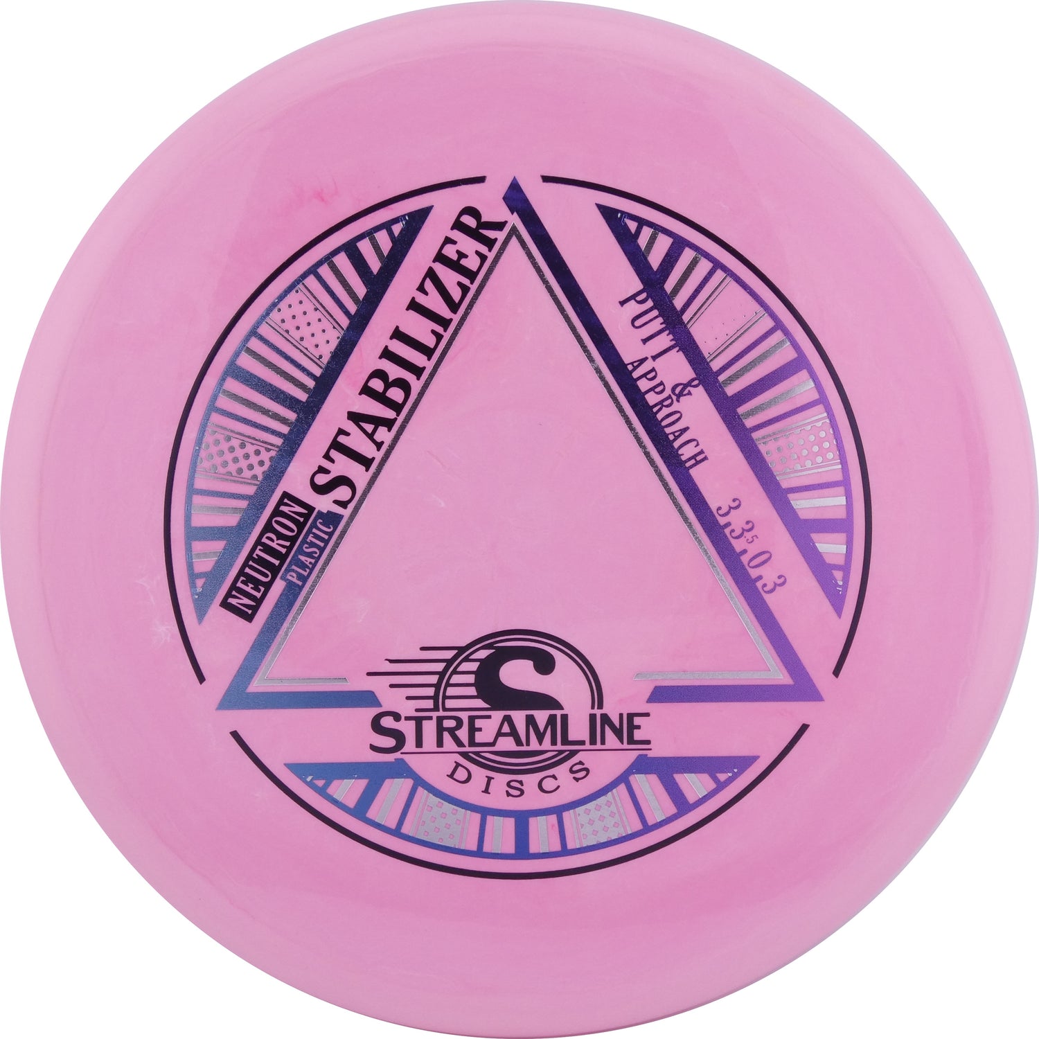 Streamline Discs: The Stabilizer is an overstable putter from Streamline Discs, making its debut in Streamline Neutron and Cosmic Neutron plastic. This is the second putter from Streamline Discs and is the overstable compliment to the Streamline Pilot. The Stabilizer has a similar hand feel and depth as the Neutron Pilot, but with a slightly raised shoulder and more pointed nose that produces a flatter and more stable putter. The Stabilizers defining flight characteristic is straight flights with minimal turn, into a strong finishing fade for point and shoot accuracy on the approach.